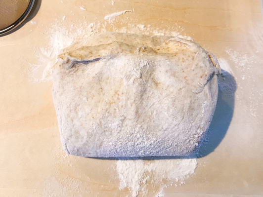 上から茶漉しで粉を振り、スケッパーで周りをはがし、ボウルを逆さにして、台に生地を出す。