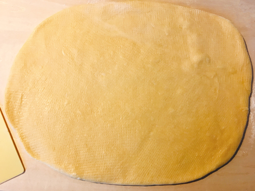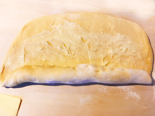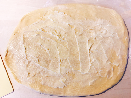手粉をし、再度ガスを抜き、35×25cmに伸ばす。上下はのこし、シュガーバターを全体に広げる。