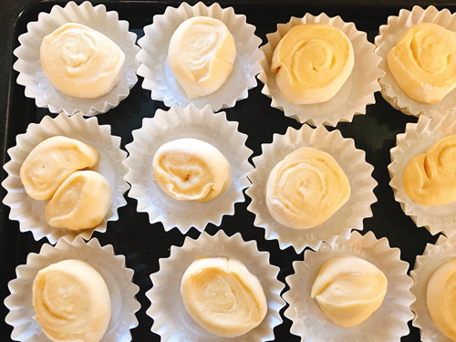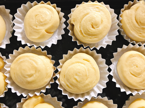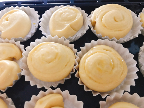 天板に並べたマドレーヌカップに切った生地をのせ、1.5倍なるまで2次発酵。
