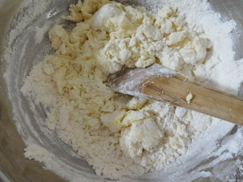 ふるった薄力粉を加え木ベラでさっくりと混ぜる。粉が残っているうちに生地を100gと25gにとりわける。
