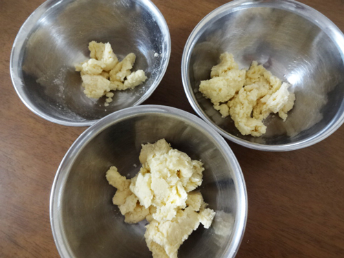 100gにはココアパウダー3gを、25gには紫芋パウダー2gを加えそれぞれ混ぜ3色の生地を用意する。