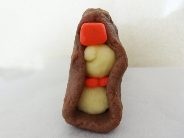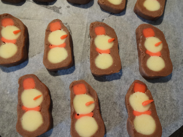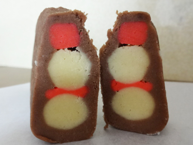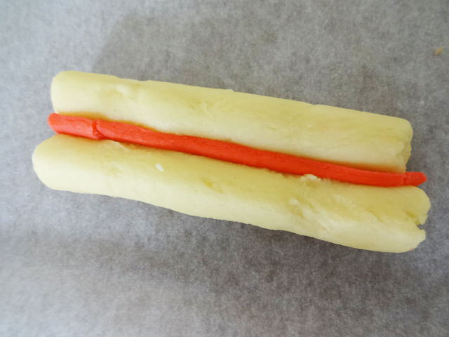 プレーン生地は2等分し直径1.5cmの円形×10cm長さに2本成形し冷凍庫で冷やす。頭と体になります