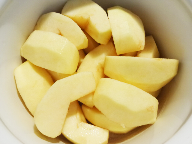 火を止めバターを加え均一に溶けたらリンゴを入れ、中弱火にかけふたをして30分煮る。