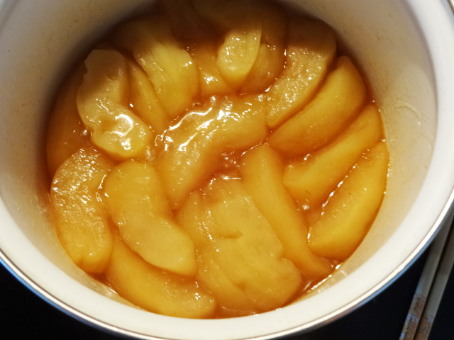 りんごのキャラメル煮の砂糖の焦がし具合によって味わいが代わります。