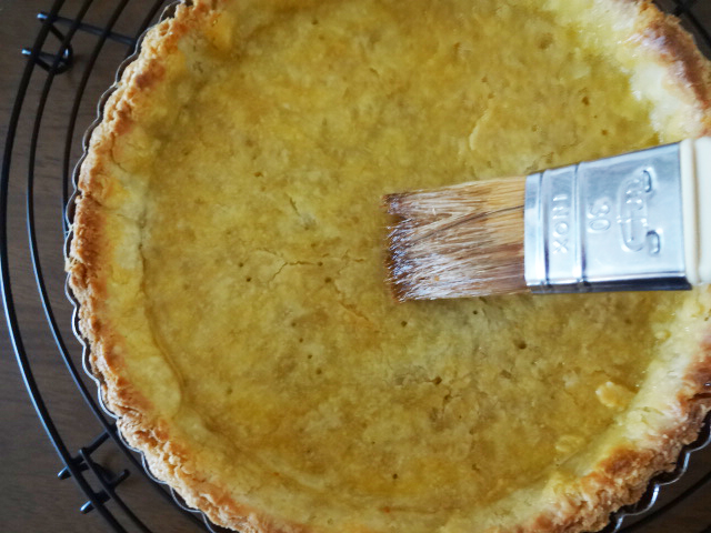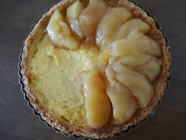 空焼きしたタルトにカスタードクリームを敷き込む。その上にりんごのキャラメル煮を並べる。