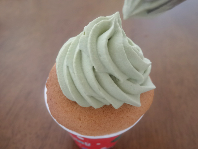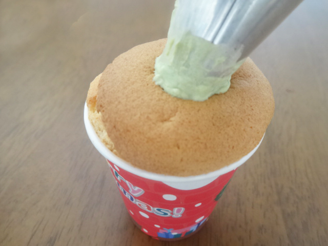 カップシフォンに口金の先を少し差し込み、クリームを中に絞り出す。表面にも絞り、カラーシュガーやイチゴで飾る。