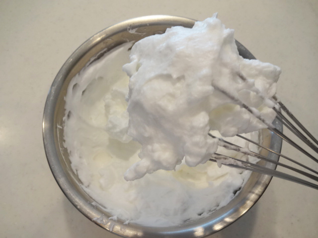 軽く角が立ってきたら残りのグラニュー糖2~3回に分けて加え、泡立てる。