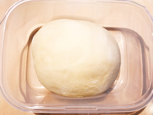 手粉をし、ガスを抜く。丸めて、密閉容器に入れ冷蔵庫に入れ60分ほど休ませる。