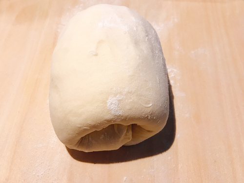 手粉をし、ガスを抜く。両端を折り、端からくるくると巻く。