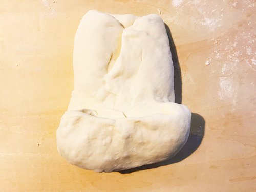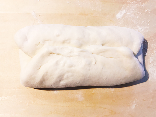 手粉をし、再度ガスを抜き、三つ折にする。ベンチタイムを30分とる。