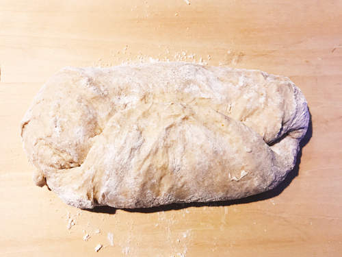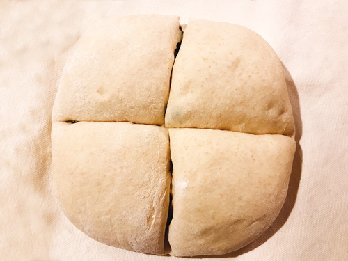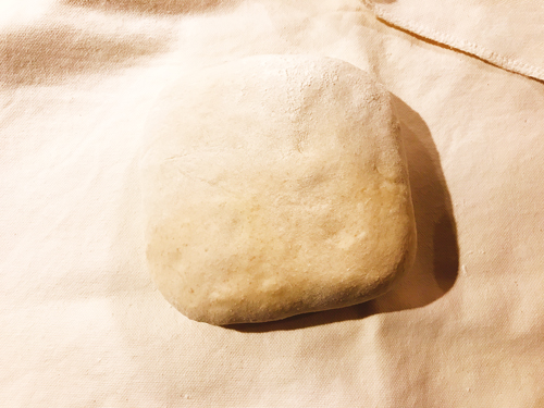 生地をスケッパーを使い、粉を振ったキャンパス地に生地をのせ、全体をビニール袋で覆いベンチタイム40分。