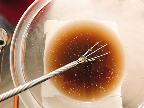 モルトパウダーを0.3g計る。電子秤にボウルをのせ、ホイッパーものせ、0にする。計ったモルトパウダーをボウルに入れる。