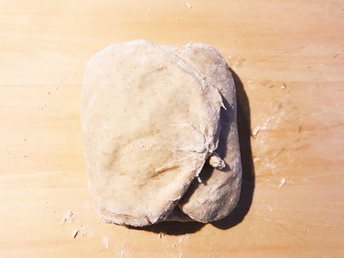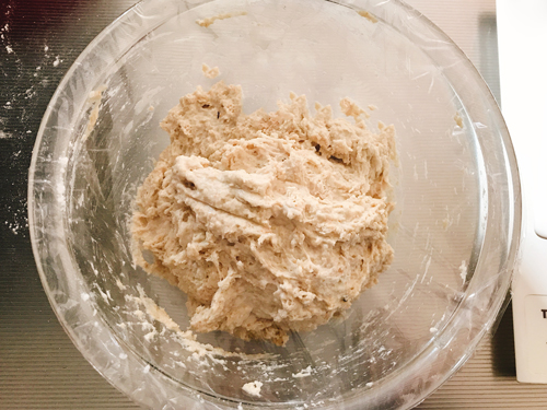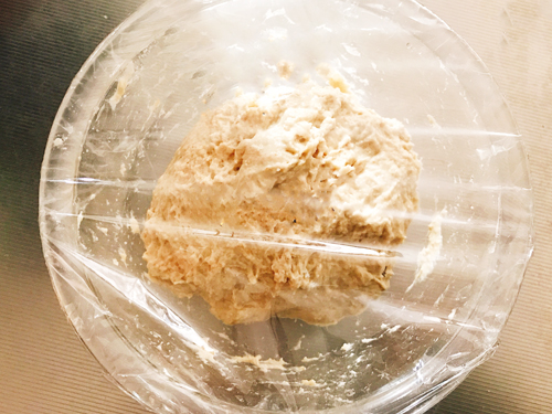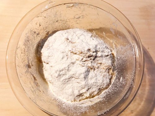 分量の塩を振り入れ、周りから畳むように混ぜる。100回ほど。ラップをして、30分休ませる。