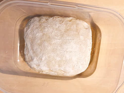 蓋付きの容器に入れ、蓋をして、野菜室で10時間、1次発酵させる。