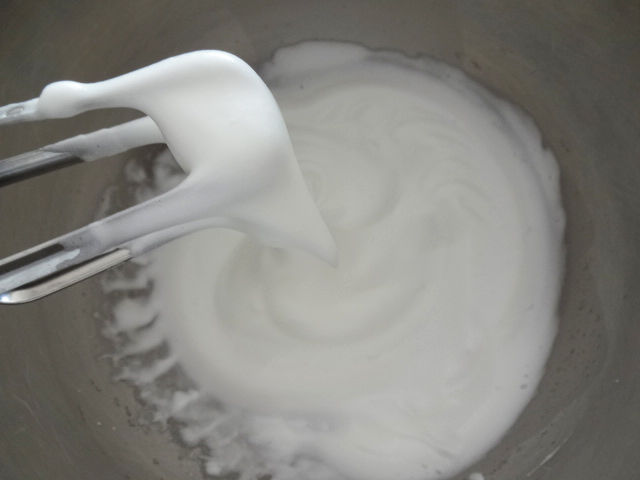 別のボウルに卵白を入れグラニュー糖20gから少量加え、ハンドミキサーで泡立てる。泡がたくさん出てきたところで残りのグラニュー糖を加え軽く角が立つ程度のメレンゲを作る。