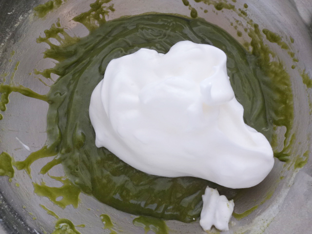 4にメレンゲをひとすくい加え泡だて器で泡が見えなくなるまで混ぜる。次に残りのメレンゲを加えゴムベラでさっくりと混ぜる。