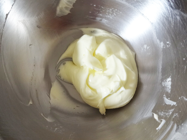 常温で柔らかくしたバターとシュガーパウダーをボウルに入れ泡だて器で白くふんわりするまでよく混ぜる。