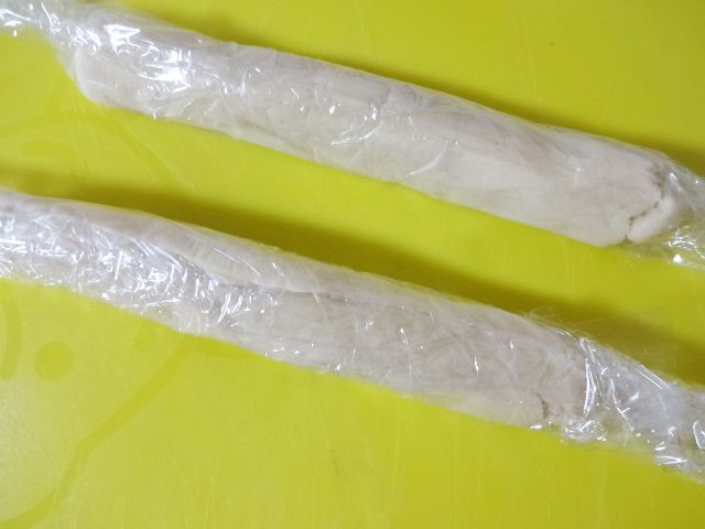 まとまってきたら二等分の棒状に成形し、ラップ材にくるんで冷蔵庫で1時間休ませる。