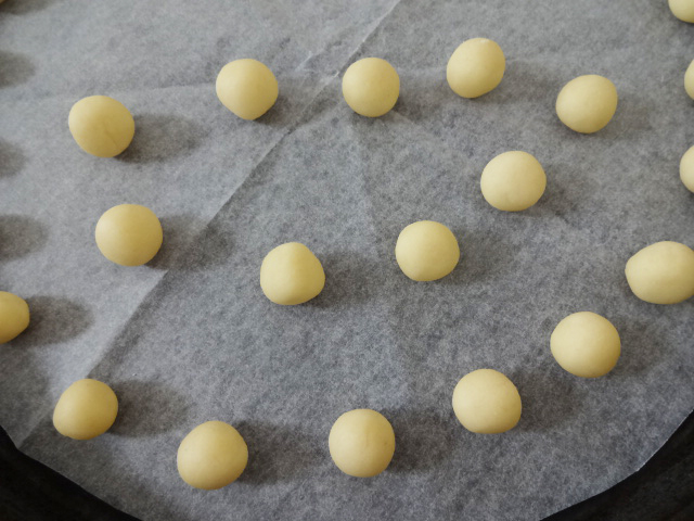 1ケ3g、1.5cm~2cmの丸形に丸め、オーブンペーパーを敷いた天板に並べる。