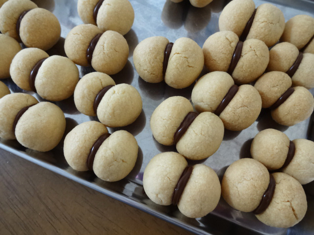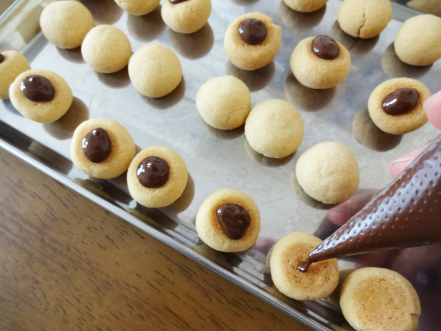 チョコを挟むときは溶かしてすぐだと流れてはさみづらいので、少しおいて絞りやすい硬さになってから絞るとうまく絞れます。