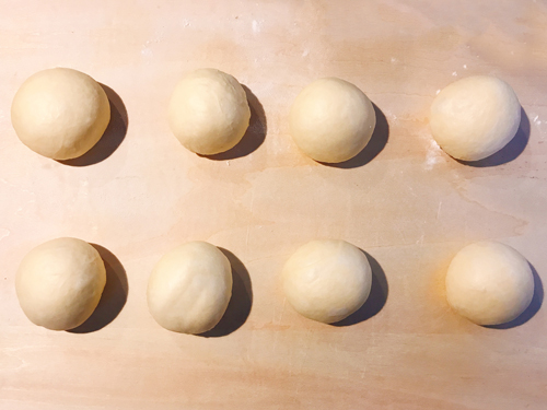 生地を取り出し、軽くパンチングする。8等分して丸める。濡れぶきんを掛け、ベンチタイム30分。