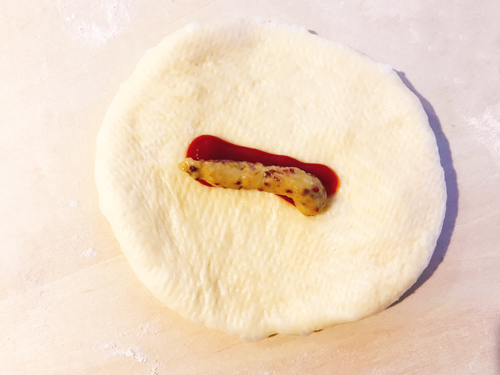 手粉をして、ガスを軽く抜き、麺棒で10cmくらいの円にする。ケチャップ、粒マスタードを適宜のせソーセージをのせる。