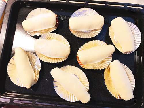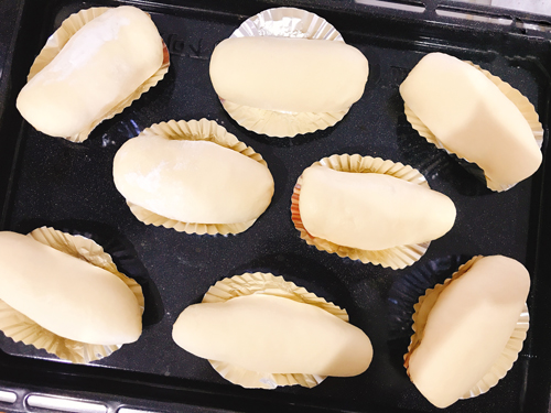銀カップを広げた物を天板に並べ、その上に成型した生地をのせていく。上からぬれ布巾をかぶせ、ビニール袋で覆い、2次発酵90分。