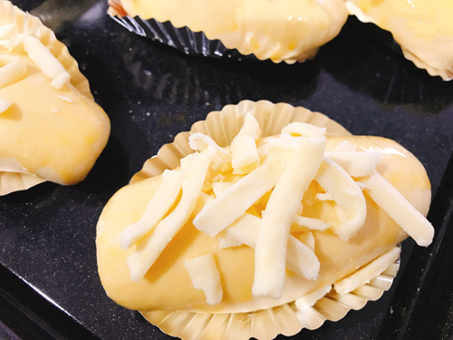 卵液を刷毛で塗り、チーズをのせる。230度予熱から190度に下げ15分焼く。