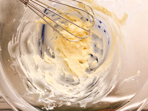 やわらかくしたバターを泡だて器でクリーム状にし、グラニュー糖をいれ白っぽくなるまで良く混ぜ合わせる。