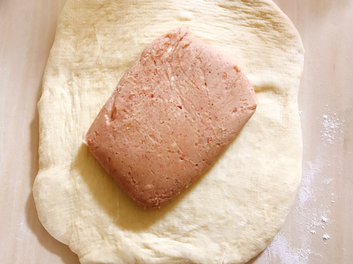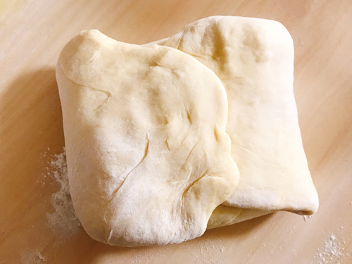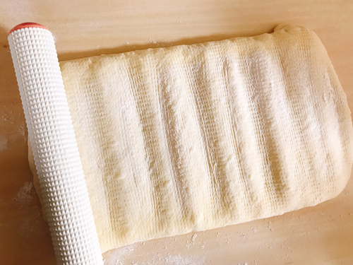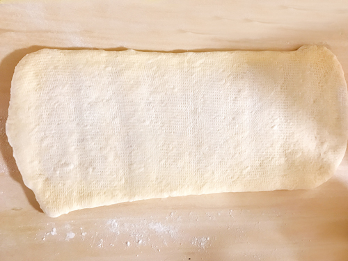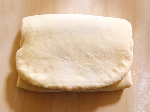 空気が入らないように四方を折る。縦方向に麺棒で伸ばす。三つ折にする。
