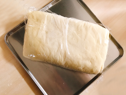 乾燥しないように、ラップで包み、冷凍庫で15分休ませる。もう1度粉を振った台に生地をおき、90度角度を変え、