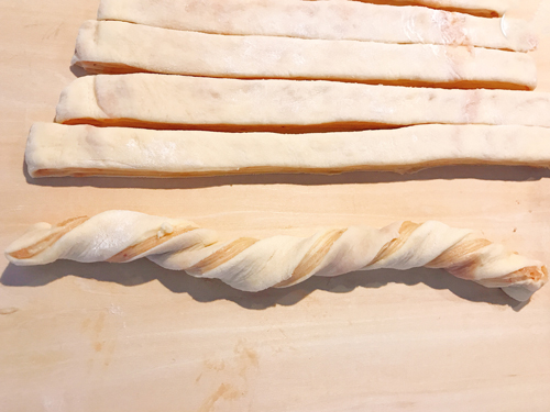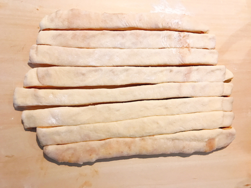 粉を振った台に生地をおき、90度角度を変え、20cm×30cmほどに伸ばし、縦に包丁で8等分する。