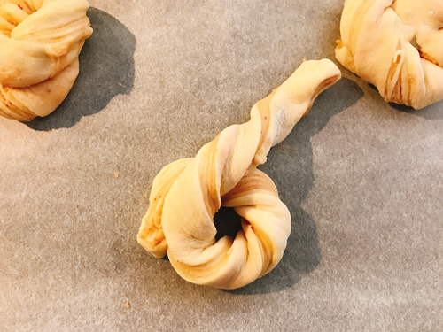 1本をくるくると巻き、まん中に円を作るように丸め、長く取った方は真ん中の穴に下から入れ込む。