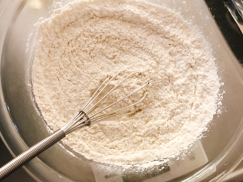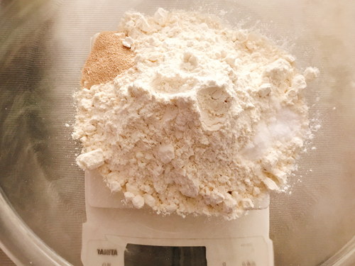 ボウルに粉、イースト、塩を入れ、ホイッパーでよく混ぜ合わせる。