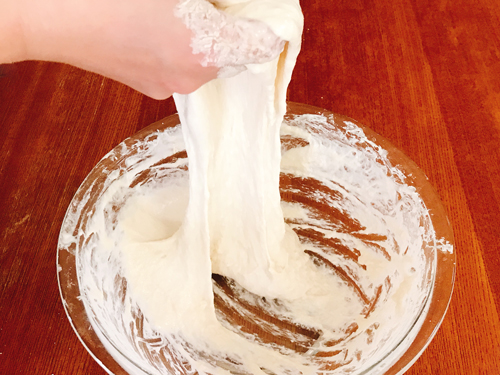 水を徐々に入れ、手で粘りが出てボウルから生地が少しはなれるようになるまでひたすら混ぜる。