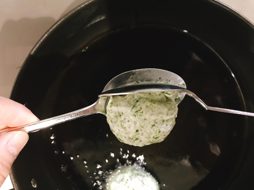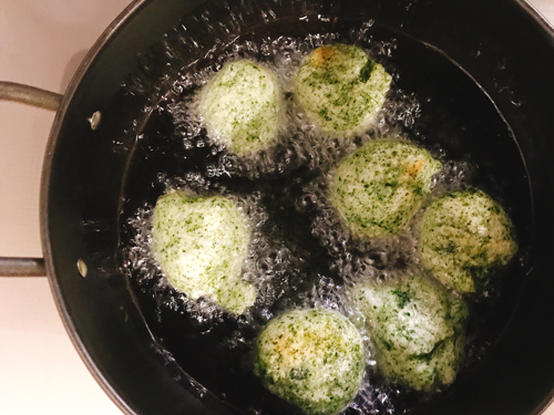 170度の油にスプーンを使って落としいれ、生地が上に上がってきて表面が色づくまで揚げる。