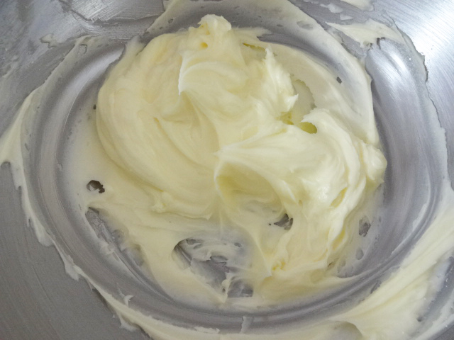 ボウルに常温において柔らかくなったバターを入れ泡だて器でクリーム状に混ぜ、シュガーパウダーを加えよく混ぜる。