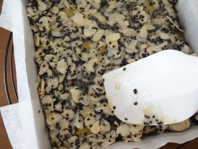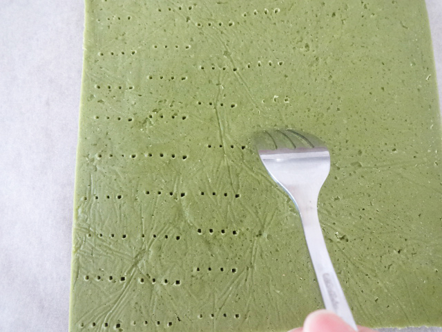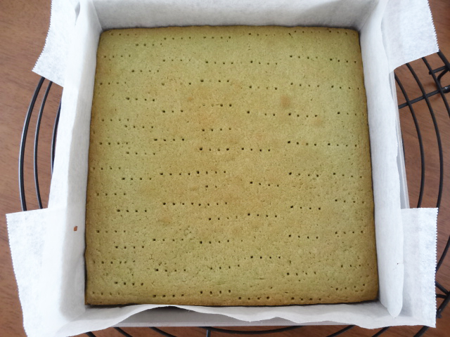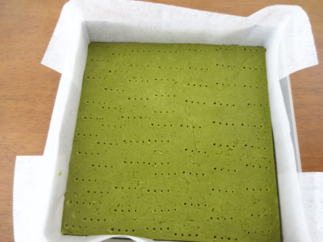 オーブンを160℃に温める。フォークで表面に穴をあける。オーブンペーパーを敷いた型に生地を入れ160℃のオーブンに入れて30分焼く。