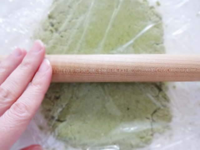 ラップ材で挟みなおししっかりと手で押し固めるようにしてから麺棒で1cm厚さにし、冷蔵庫で1時間休ませる。
