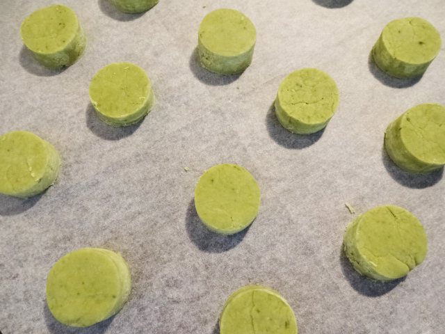 オーブンを150℃に温める。生地を冷蔵庫から出し2.5cmの抜型で丸く抜く。オーブンペーパーを敷いた天板に並べ、150℃のオーブンで25分焼く。