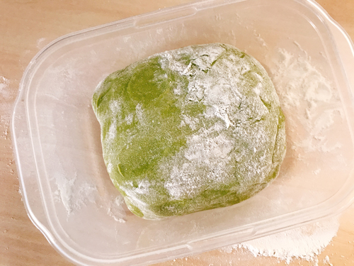 手粉をし、ガスを抜く。丸めて、密閉容器に入れ冷蔵庫に入れ30分ほど休ませる。