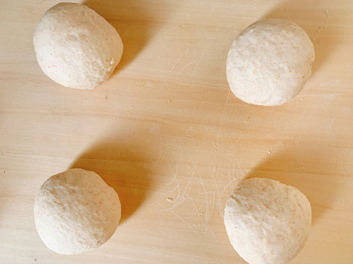 生地を4等分する。はりを持たせるように丸める。濡れ布巾を掛け、全体をビニール袋で覆い10分ほど休ませる。