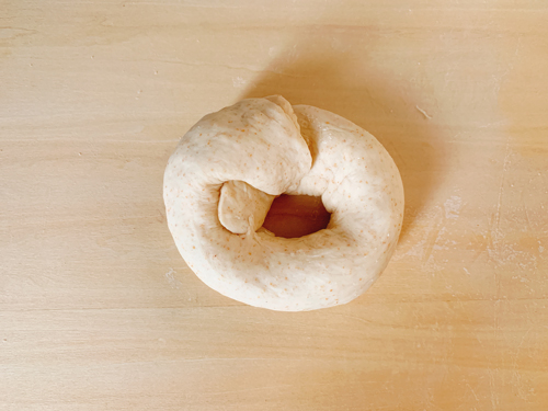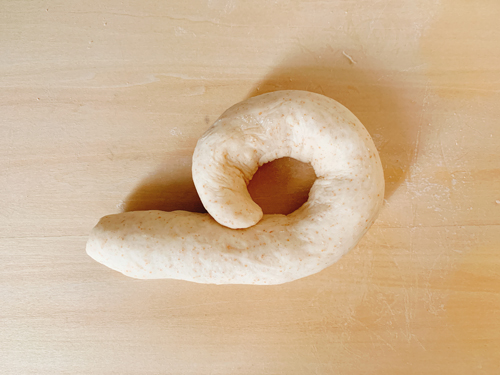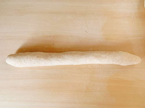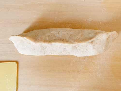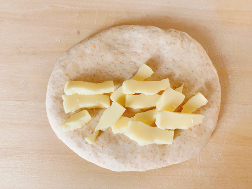 成形する。手でのばし、チーズをのせる。端から巻いて、とじ目をしっかりと付ける。