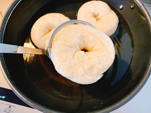静かにふつふつと沸くぐらいに火加減を調節し、表裏1分30秒ずつゆでて穴あきお玉と布巾を使って引き上げる。