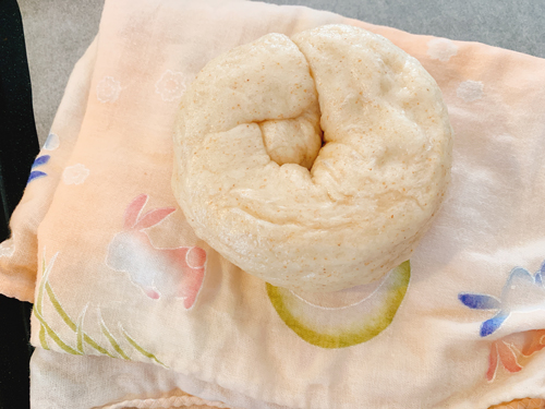 先程の天板に並べ、濡れ布巾を掛け、ビニール袋で全体を覆う。一回り大きくなるまで生地を休ませる。