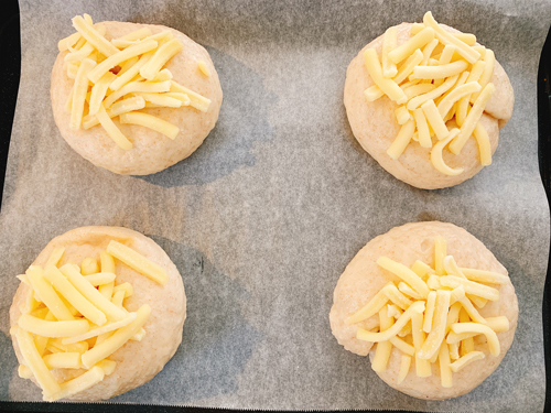 ピザ用チーズをのせ、オーブンを230度に下げ、15分焼く。