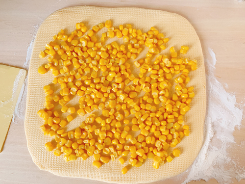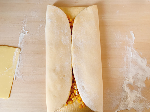 水気をきったコーンを広げ、両端を折りたたみ端から巻いていく。