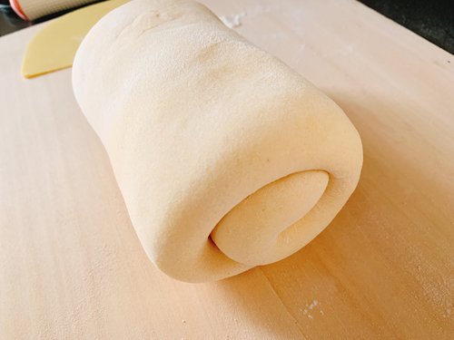 打ち粉をした台にあけ麺棒で25cm四方に伸ばす。