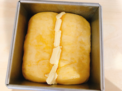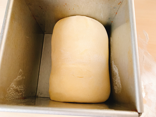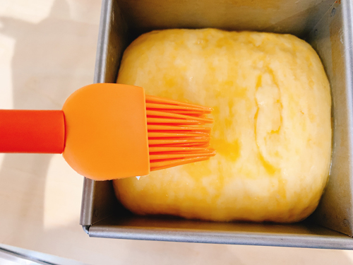 オイルを塗った型に入れ、全体をビニール袋で覆い2次発酵。型の8分目まで来るくらい。