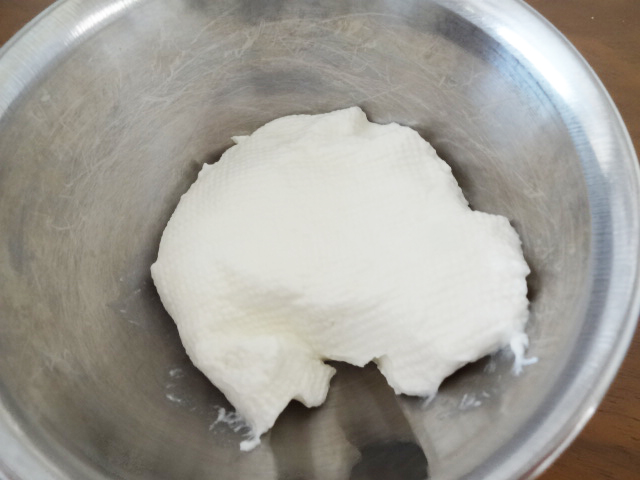 (前日に準備します)ボウルにザルを重ねキッチンペーパーを敷きヨーグルトをおいて冷蔵庫で一晩水切りをする。